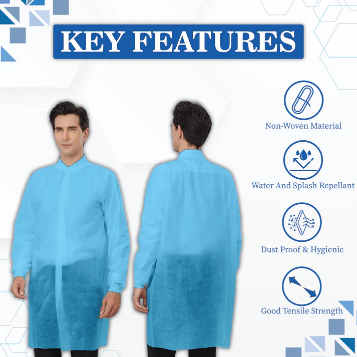 Perfect for laboratories, hospitals, pharmaceutical units, diagnostic centres, food processing areas, and cleanroom facilities, this disposable lab coat helps maintain hygiene without the need for washing or reuse. Each pack includes 10 single-use lab coats, making it a cost-effective and time-saving PPE solution.